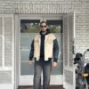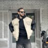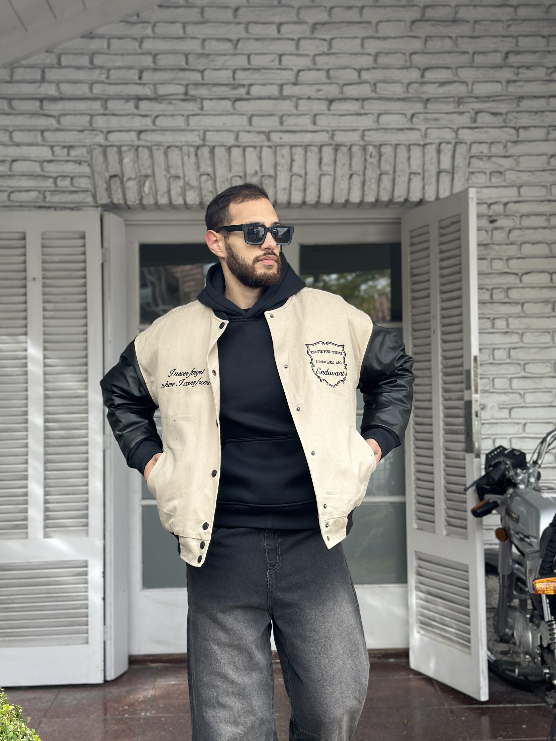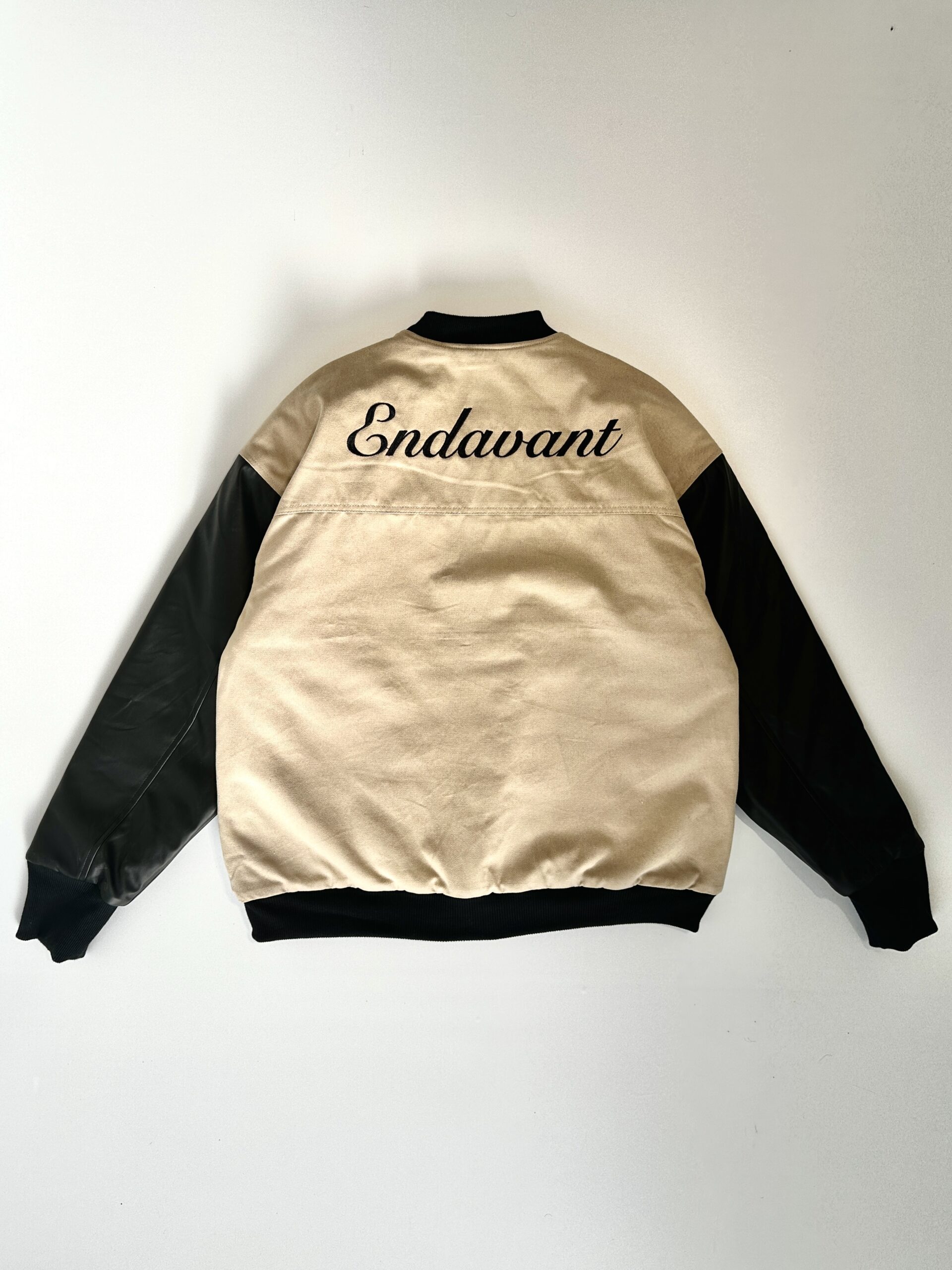 Bomber con cuerpo en tono beige y mangas negras, confeccionada en materiales de alta resistencia. Presenta bordados al frente y en la espalda con la palabra Endavant, que refuerzan su identidad única. Incluye cierre con broches metálicos, ribb en cuello, puños y cintura, y un interior matelasseado que aporta abrigo y comodidad. El talle M calza bien hasta un modelo de 1.90m de altura resaltando el corte boxy