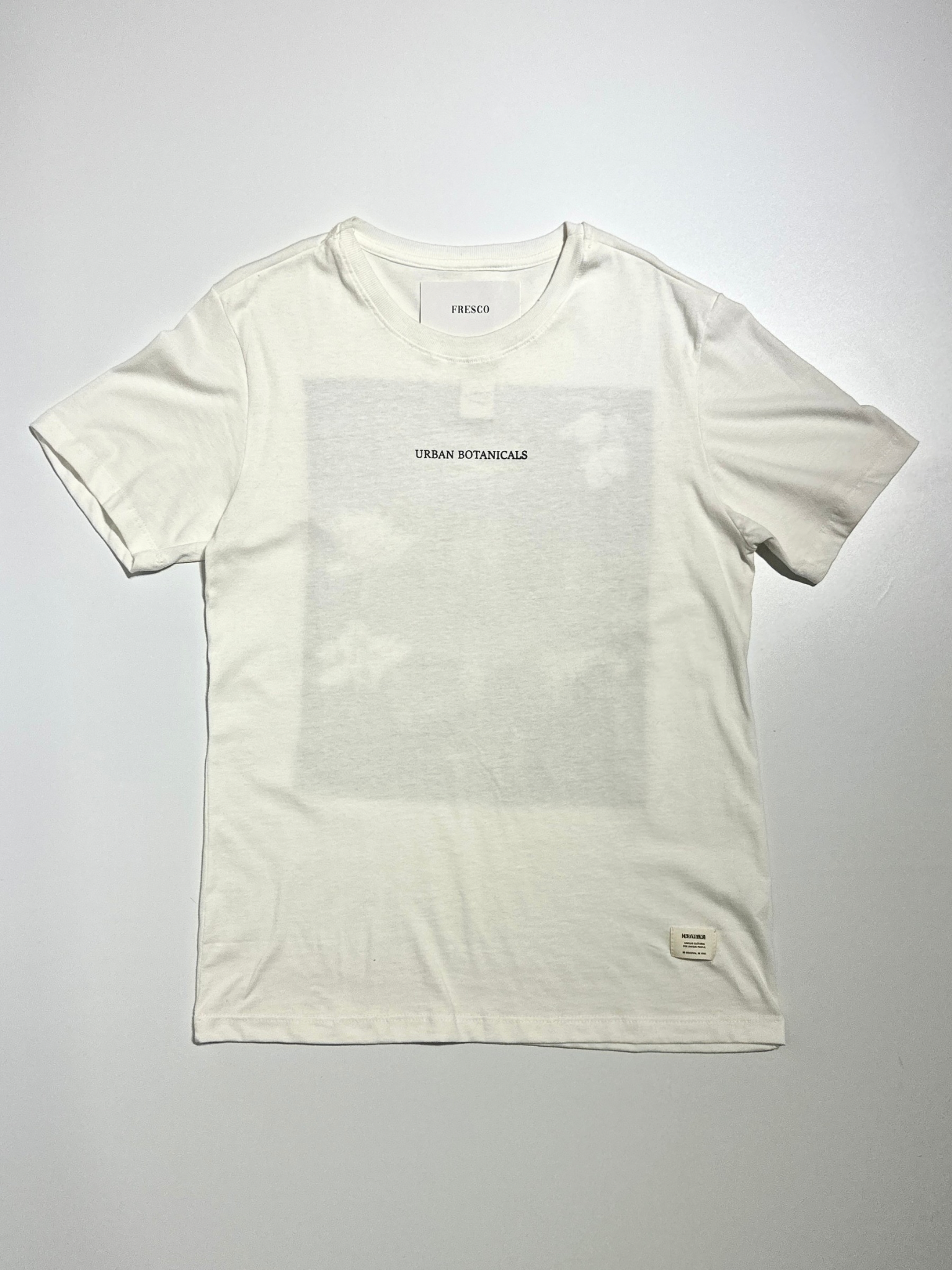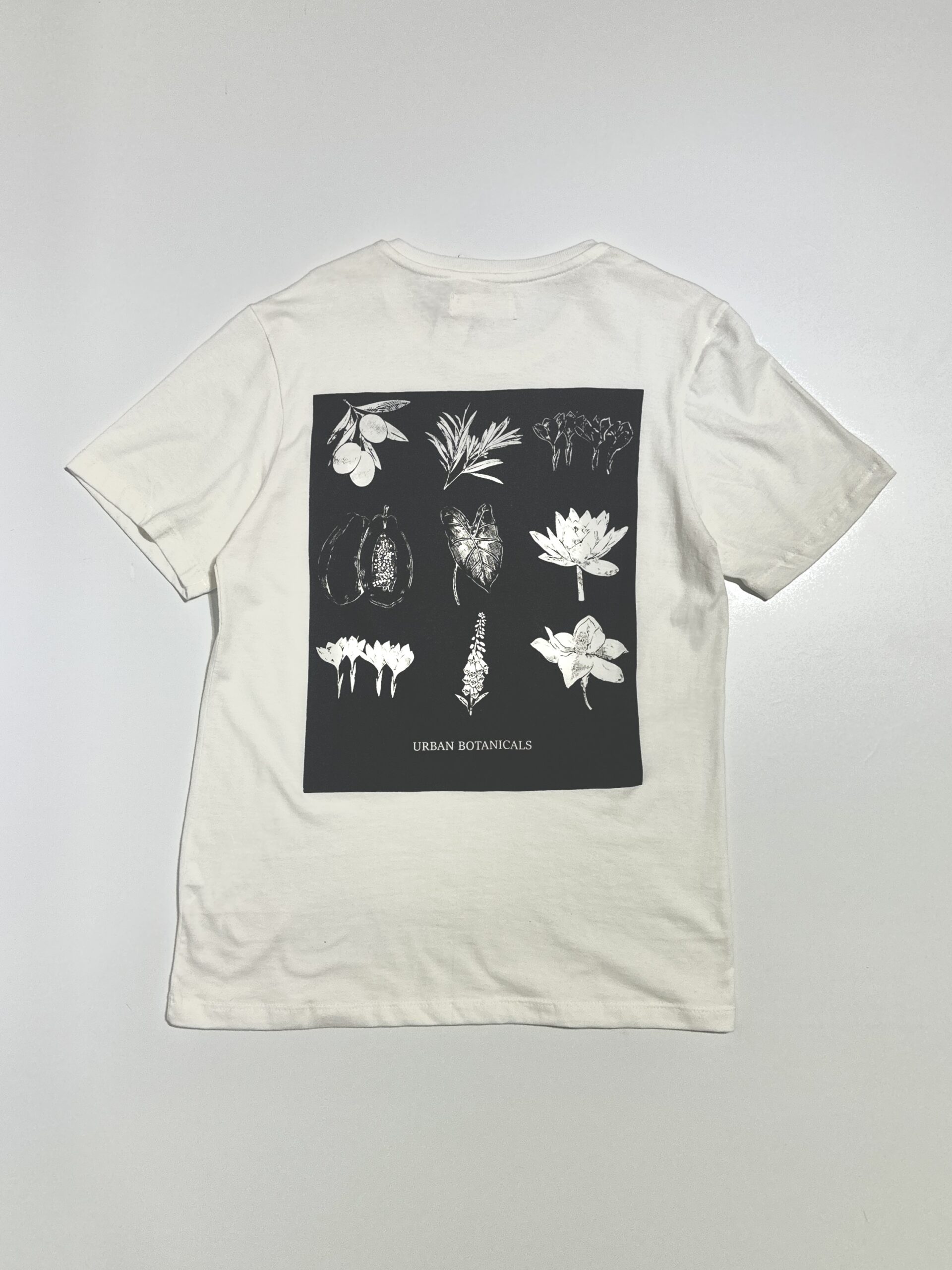 Remera blanca de corte regular, confeccionada en algodón suave para un calce cómodo y versátil. Destaca por su estampa trasera en alto contraste con motivos botánicos y la inscripción Urban Botanicals, que aporta un aire artístico y moderno.